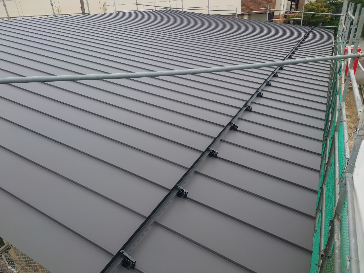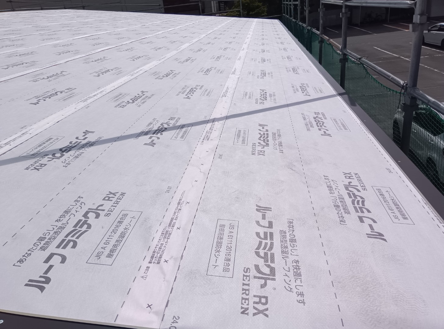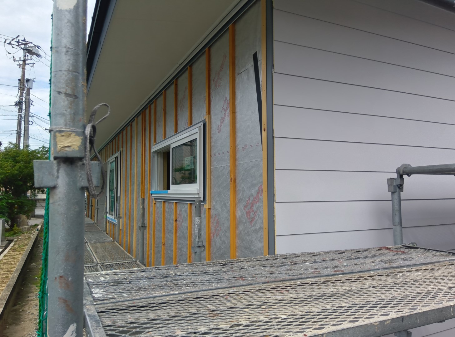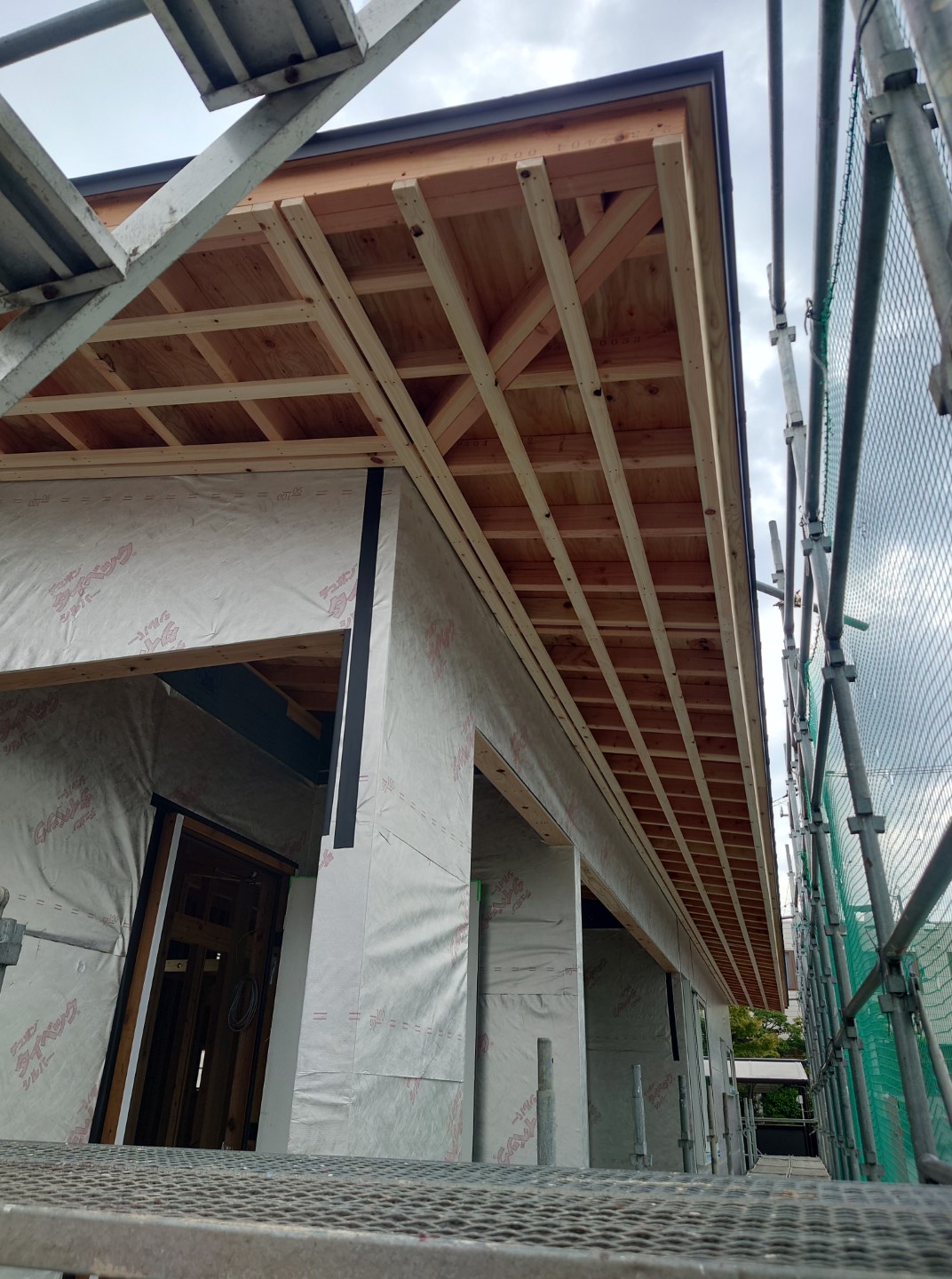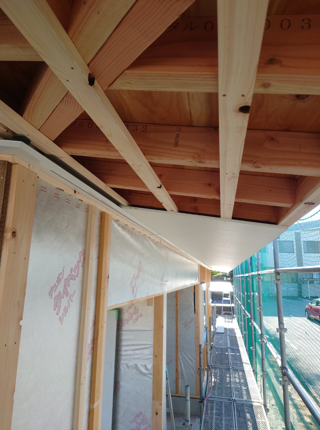 外部では防水シートを壁に貼り、軒裏の下地を行います