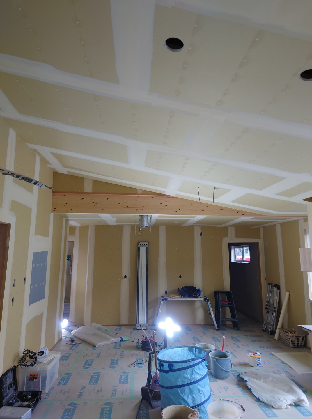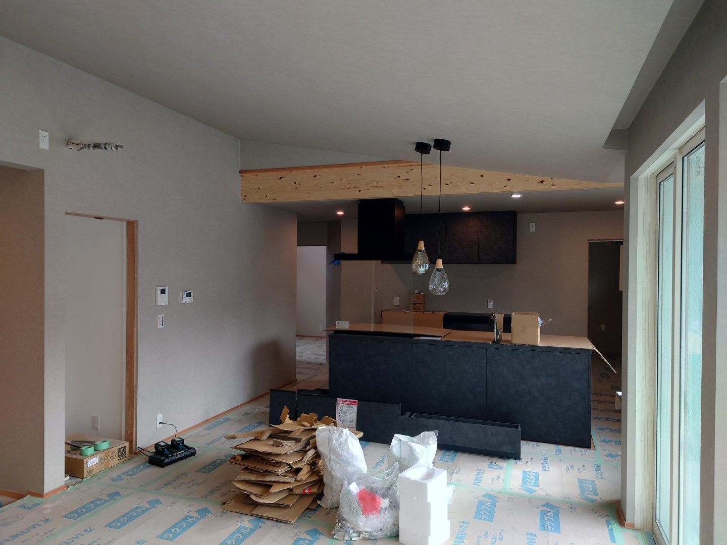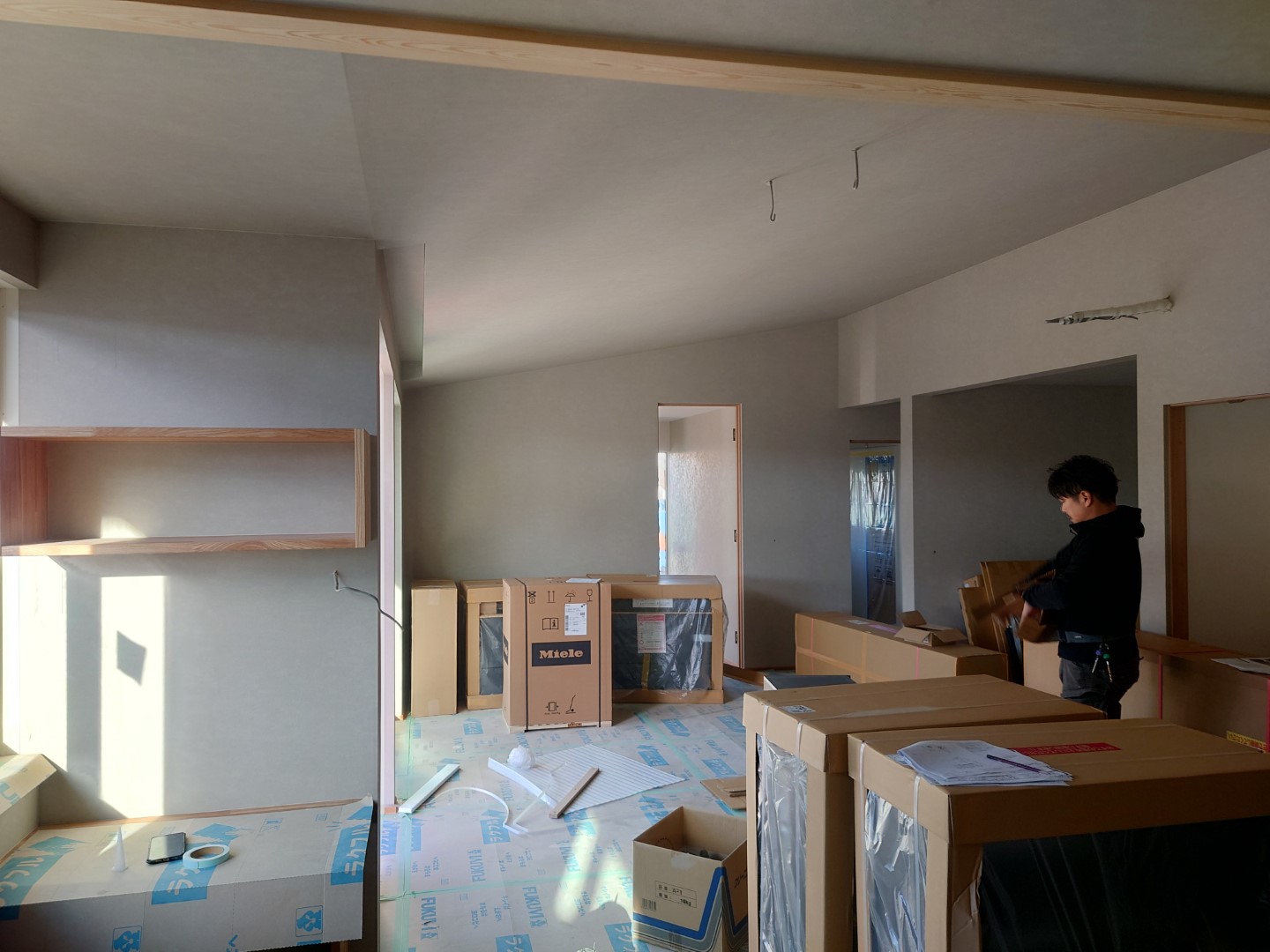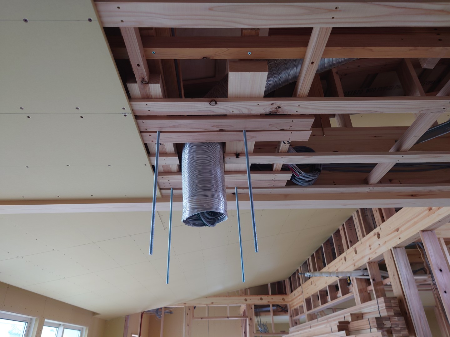 内部では天井の下地ボード貼り。独立型のレンジフードは位置がシビアです。