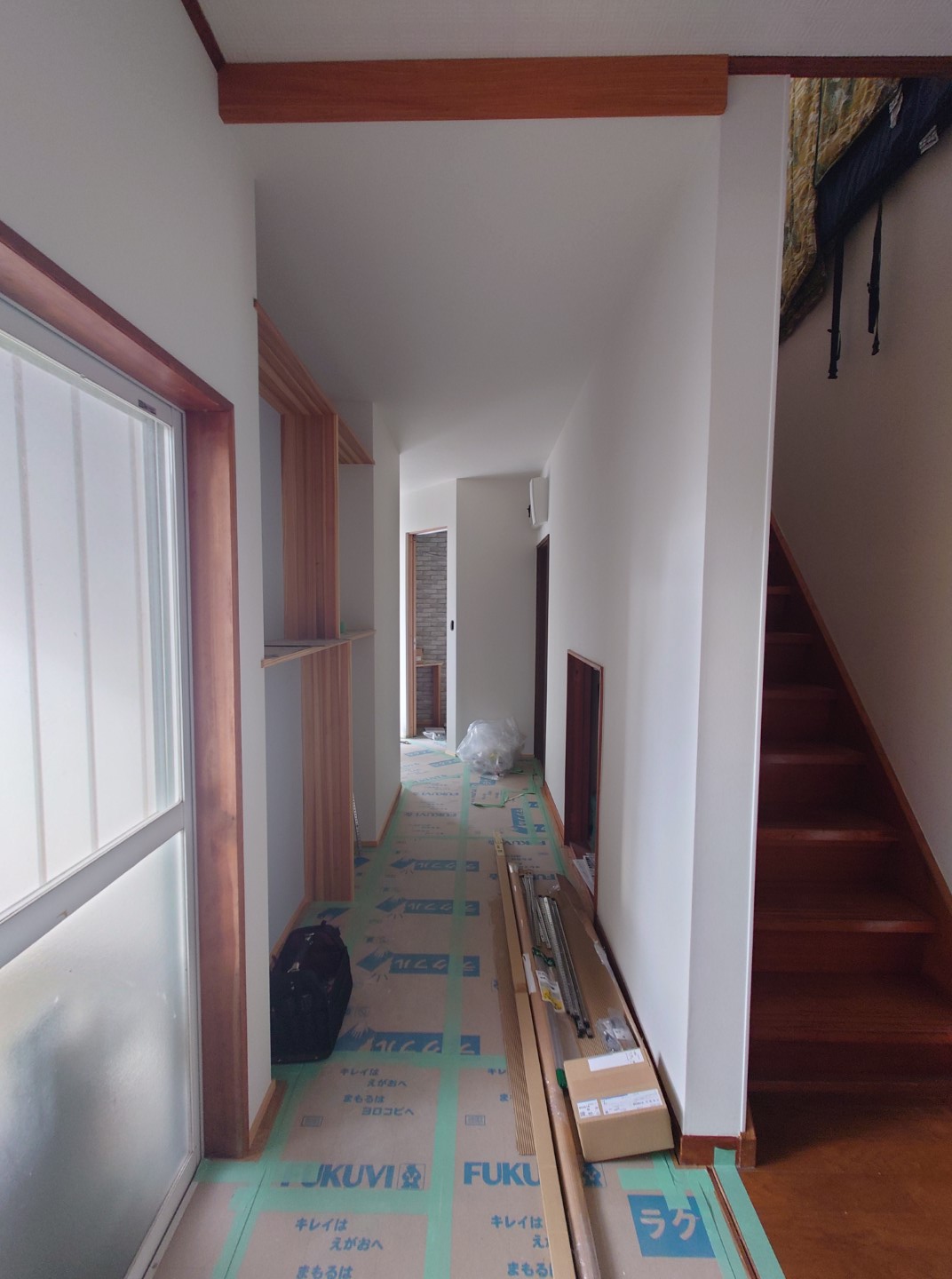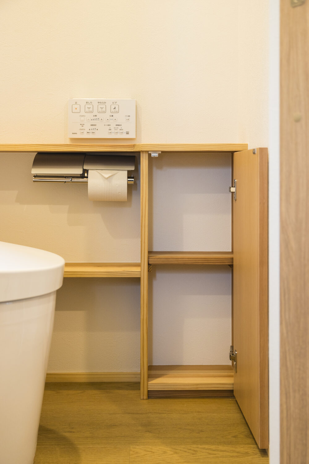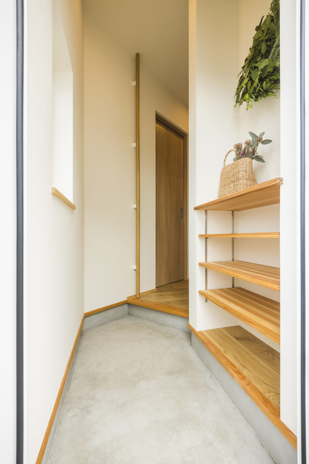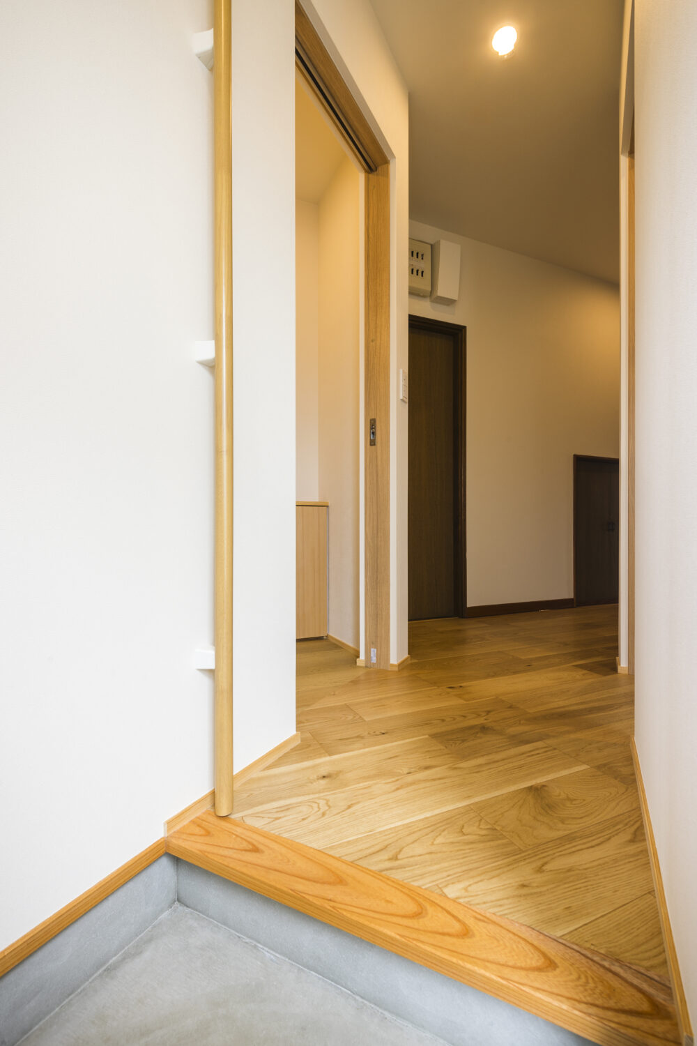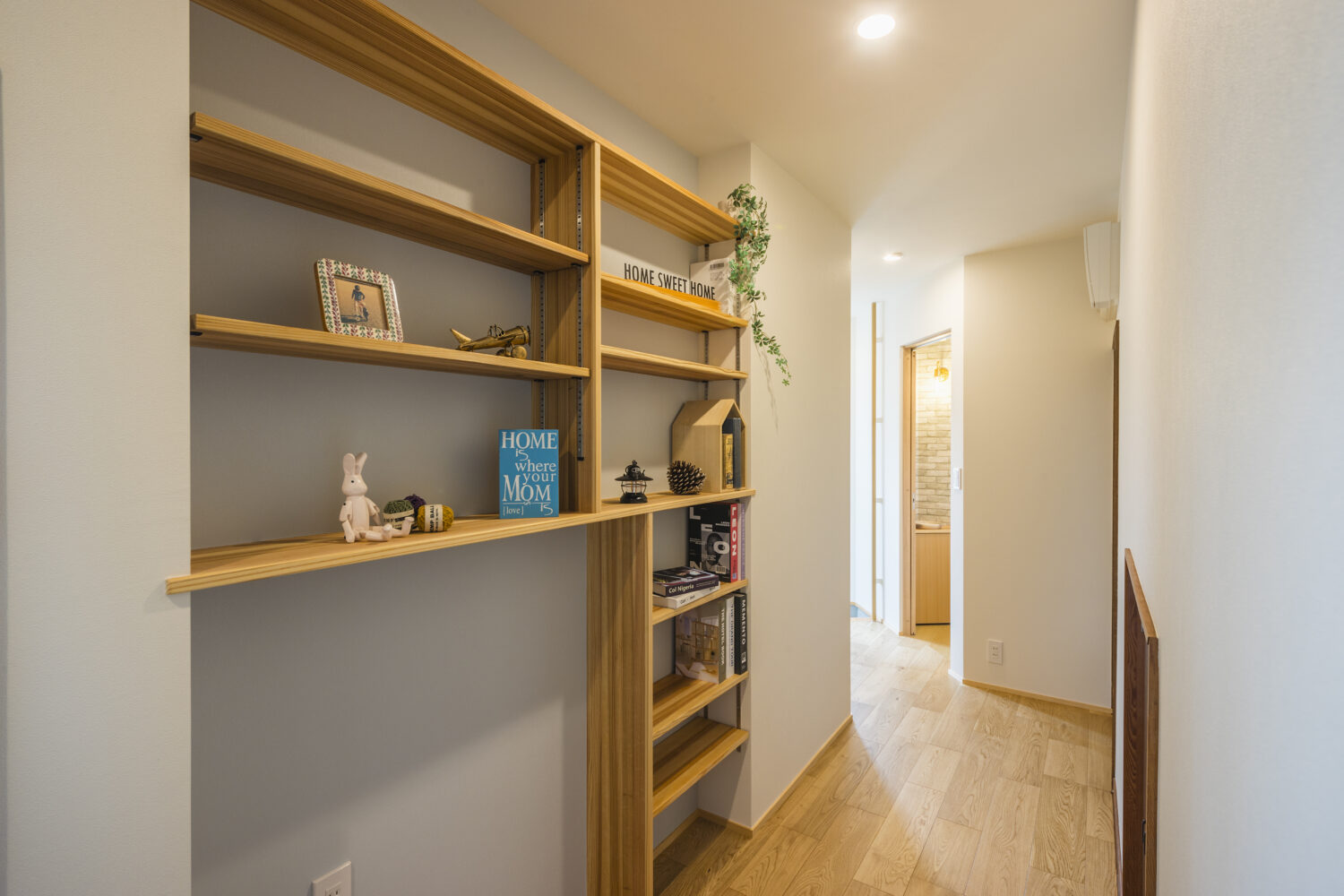 廊下の先には細かい物が片付く凹みの可動棚スペースも設置しました