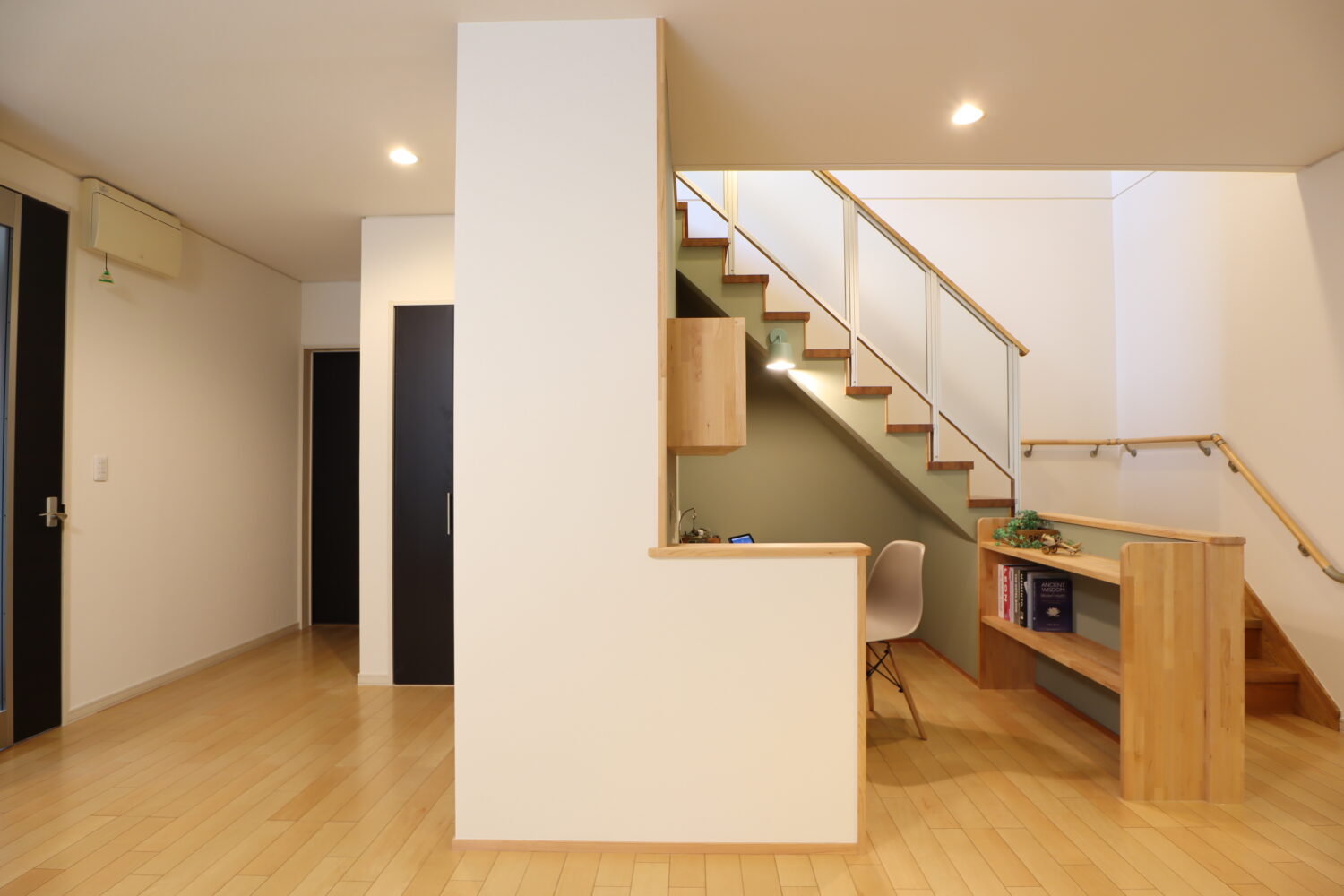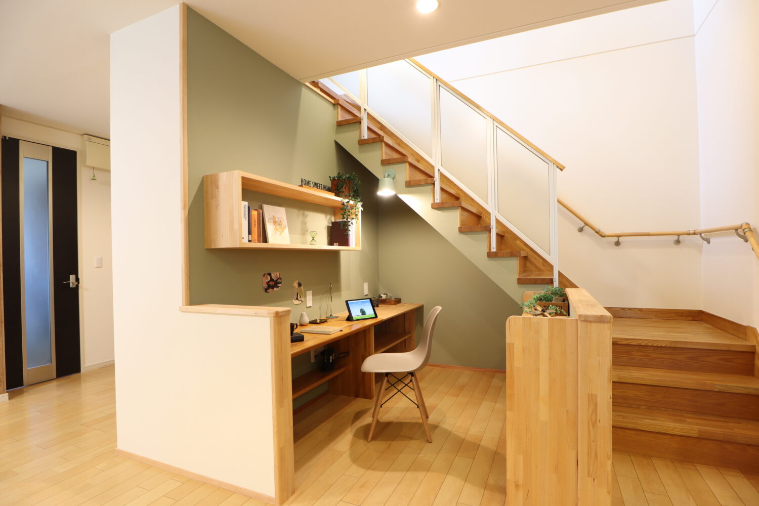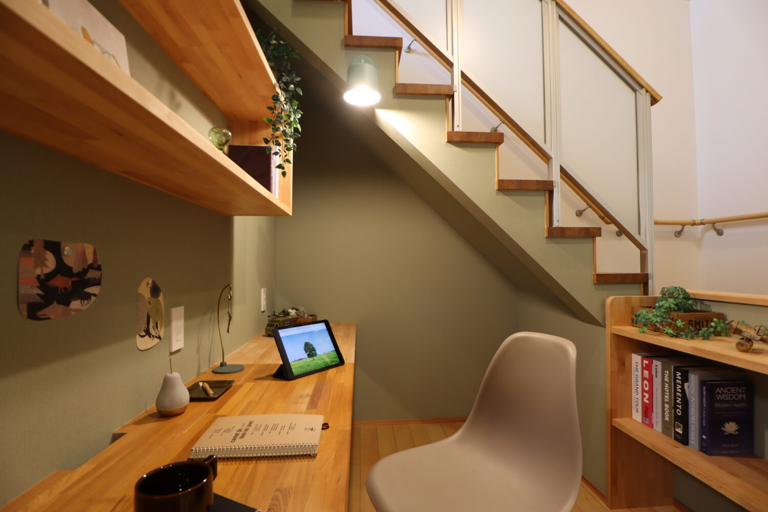 そこで階段下も利用して、ブースっぽく囲われた空間を作りました。デスクの壁の反対側には収納も増設しました。